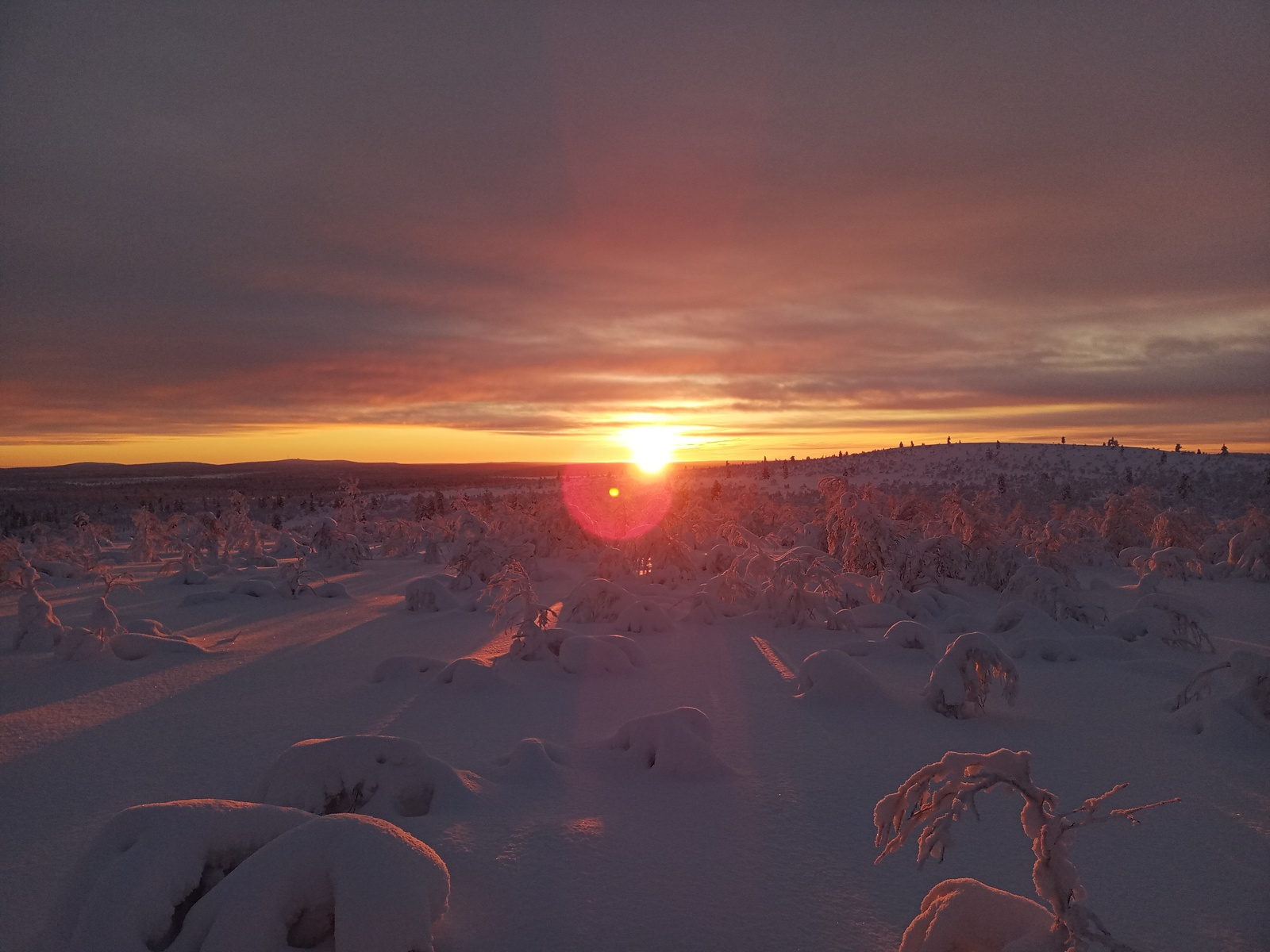 Our amazingly powerful center of the solar system was shining today with it’s full power over the arctic circle being completely over the horizon. The surrounding tunturis were ignited in a dark red color and the hole light show, which was better then every human made fireworks could be, lastet over 90 minutes. This was so epic.